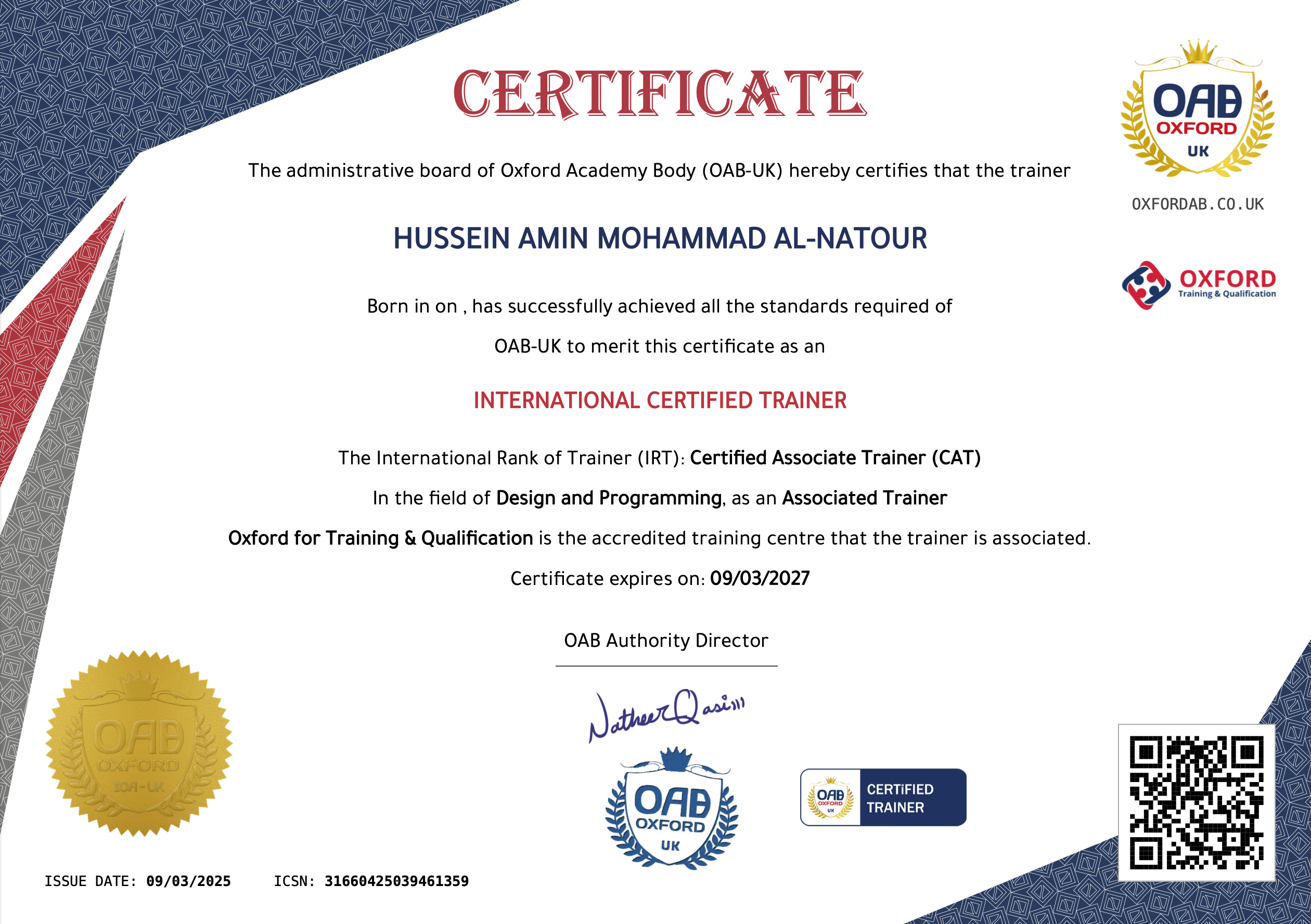 Hussein Amin Mohammad Al-Natour is a Certified Associate Trainer with Oxford for Training and Qualification, and for over 18 years he has poured his passion into the worlds of sound, design, and media. From the intensity of live broadcasts and the thrill of sports events, to the precision of studio work and the creativity of graphic design, Hussein has left his mark as both an engineer and an artist. His journey has woven together the technical and the creative—managing sound, editing audio, maintaining studios, and shaping visual stories through design and animation. Beyond his own craft, Hussein is equally devoted to sharing knowledge, training others in Arabic and English across design, programming, press, and media. With every project and every training session, he blends expertise with heart, turning experience into inspiration and practical skills into empowering opportunities for others.